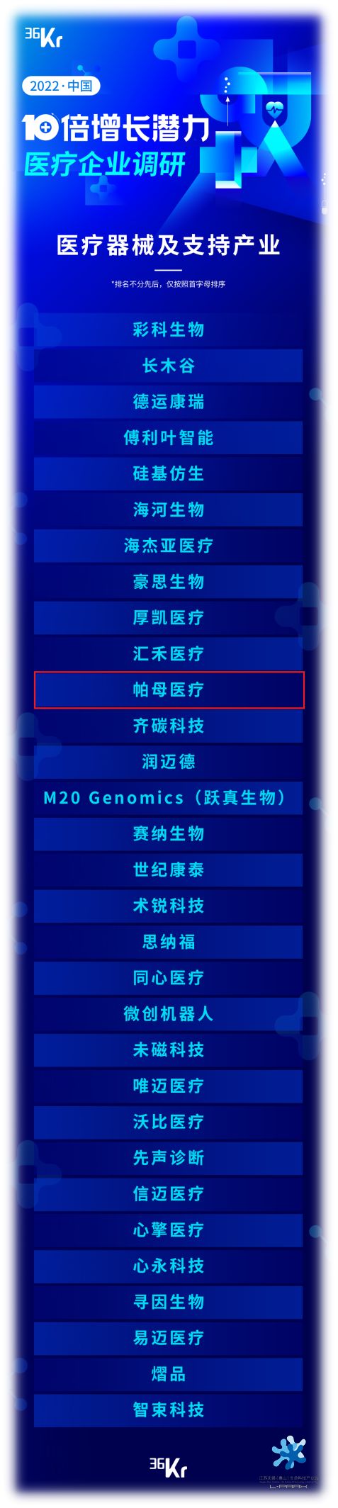 日前,由36氪主導、“2022年中國10倍增長潛力醫(yī)療企業(yè)”調(diào)研結(jié)果公布,共100家企業(yè)登上生物醫(yī)藥及其支持產(chǎn)業(yè)、醫(yī)療器械及支持產(chǎn)業(yè)、數(shù)字健康、合成生物四大領域榜單;帕母醫(yī)療上榜其中的醫(yī)療器械及支持產(chǎn)業(yè)類。